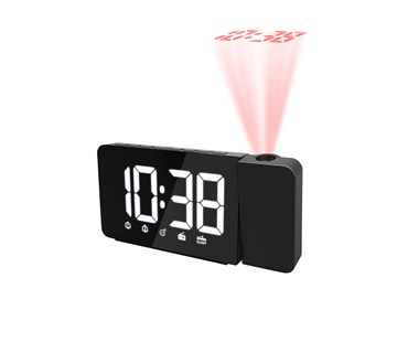 velký LED displej s bílým podsvícením tři úrovně jasu displeje + vypnuto při vypnutém displeji je možné mít zapnutou projekci, a naopak projekce času na zeď dvě úrovně jasu projekce + vypnuto možnost otáčení projektoru v rozsahu 0 - 180°, rotace světelné projekce po 90° dva budíky (buzení rádiem nebo alarmem) FM rádio, automatické ladění stanic funkce odloženého buzení (vypnuto; 0 - 60min) rozměry: 170x84x39mm barva: černá napájení: DC5V (napájecí adaptér je součástí balení); 3V CR2032 (není součástí balení)