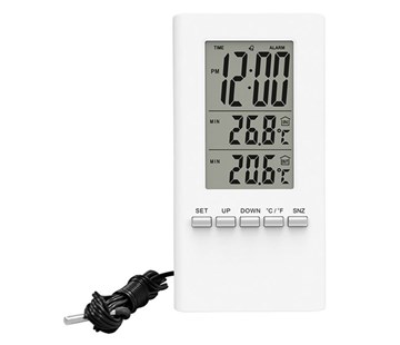 Měření vnitřní teploty: -10°C až +50°C, měření venkovní teploty: -40°C až +70°C, paměť minimálních a maximálních teplot, čas, budík, délka kabelu se senzorem: 1,5m, napájení: 1 x LR54 (AG10) baterie (součástí balení), barva: bílá.
