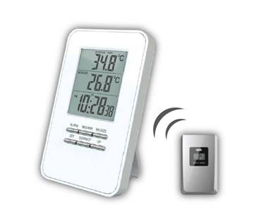 Měření vnitřní teploty: -9°C až +50°C, měření venkovní teploty: -50°C až +70°C, paměť minimálních a maximálních teplot, 1 bezdrátový senzor (součástí balení), čas, budík, napájení: hlavní jednotka: 2 x AAA (LR03) baterie (není součástí balení), senzor: 2 x AAA (LR03) baterie (není součástí balení)