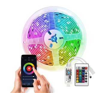 LED SMART WIFI pásek je ovládaný chytrým telefonem. Barvy světla (RGB), odstíny bílé (3000-6500K). 90 x LED/m, max. 20W/5m, světelný tok max. 200lm/m, krytí: IP65, Samolepící 3M páska, Adaptér: AC 230V / DC 12V, 2000mA, 1x dálkový ovladač, cívka: 5m