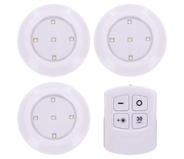 LED světélka s dálkovým ovládáním; světelný tok: 3x 50lm; možnost stmívání a vypnutí pomocí 30min. časovače; barva světla: 5000-6000K; napájení: 3x AAA baterie pro světla (nejsou součástí); 2x AAA baterie pro ovladač (nejsou součátí); dálkový ovladač + manuální vypínač; materiál: ABS plast