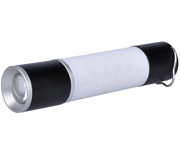 Solight WN43 LED nabíjecí svítilna s kempingovou lucernou a powerbankou, LED dioda: T6 LED + 40x SMD, svítivost LED: 250lm, 3 režimy svícení, teleskopický focus/zoom svícení, akumulátor: Li-Ion 3,7V 1500mAh, doba svícení: min. 3hod./max. 6hod., IP44, materiál: hliník, rozměry: 154 x 28mm.