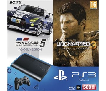 SONY PS3 500 GB + hra GT5, UNCHARTED 3 herní konzole. Kapacita interní paměti 500 GB, USB, bluetooth, podpora 3D zobrazení, propojení s PS Vita, mechanika BD-R, bezdrátový ovladač Dualshock 3. Rozměry: v. 20 cm, š. 35 cm, h. 25 cm.