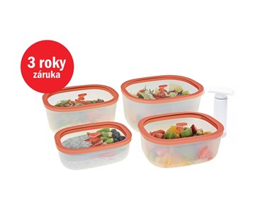 Vakuové dózy: 0,5; 0,9; 1,4 a 2,3 l + ruční pumpa, dvoustupňová ochrana uzavření, dózy z pevného a odolného BPA free plastu a skleněné víko, vhodné do myčky nádobí, mrazničky i mikrovlnky
