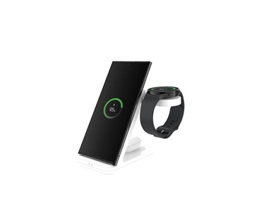 stojánek s bezdrátovým nabíjením 3v1 • hlavní nabíjecí plocha pro telefon • odepínací nabíječka pro hodinky Samsung Galaxy Watch • nabíjecí plocha pro bezdrátová sluchátka či další telefon • dvě integrované nabíjecí cívky - pro vertikální či horizontální nabíjení • soft-touch povrch pro bezpečnost telefonu • ochrana proti přepětí a zkratu • LED dioda indikující nabíjení • silikonové nožičky stojánku