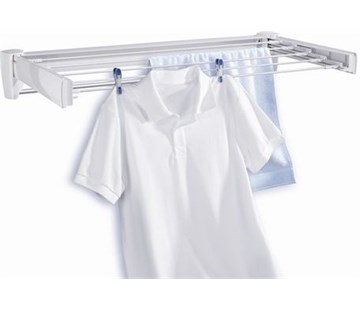 nástěnný koupelnový sušák, skládací, šetří místo, 3,6 m sušicí plochy, šířka tyčí 70 cm, samostatný chromovaný věšák na osušky,bílá, modrá