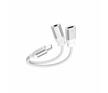NABÍJECÍ AUDIO ADAPTÉR; konektory USB-C (samec) / USB-C (samice) a 3,5mm AUX; Slouží pro propojení sluchátek a zároveň připojení dobíjení; Kompatibilní se zařízeními s USB-C konektorem;délka 12 cm