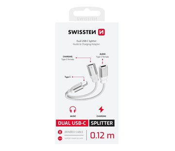 NABÍJECÍ AUDIO ADAPTÉR; konektory USB-C (samec) / 2x USB-C (samice); Slouží pro propojení sluchátek a zároveň připojení dobíjení; Kompatibilní se zařízeními s USB-C konektorem;délka 12 cm