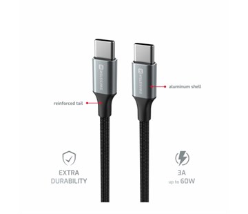 datový kabel; koncovky USB-C / USB-C; Rychlost přenosu dat 480 Mb/s; Proud až 3A; dobíjecí výkon 60 W; textilní opletení; Délka 1.5 m; Baleno v blistru