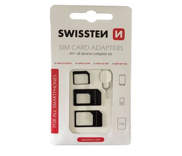 Univerzální adaptér SWISSTEN pro microSIM a nanoSim.Obsahuje adaptér z NanoSIM na MicroSIM, z MicroSIM na standardní SIMkartu, z NanoSIM na standardníSIM kartu a také eject pin key pro vysunutí SIMkarty u vybraných smartphonů. Baleno v blistru Swissten