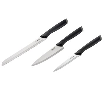 Sada nerezových nožů s ergonomickou rukojetí s měkkým povrchem. . Vysoce kvalitní čepele z nerezové oceli zajišťují vynikající řezný výkon a odolnost. Sada Essential, složená z kuchařského nože 15 cm – ideálního na sekání, krájení a porcování všech druhů potravin, univerzálního nože 12 cm – vhodného na loupání, krájení i sekání, a z nože na chléb 20 cm – ideálního na krájení všech druhů pečiva, je vaším nejlepším pomocníkem v každodenním vaření