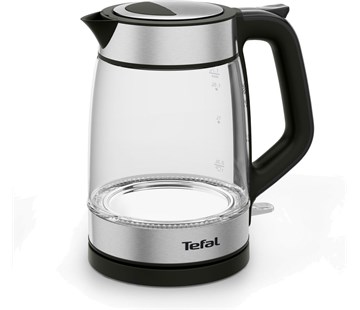 Skleněná rychlovarná konvice Tefal, měrné rysky, objem 1,7 l, snadno se čistí, modré osvětlení během vaření. Vyjímatelný odvápňovací filtr. Otevírání jednou rukou. Opravitelnost po dobu 15 let.