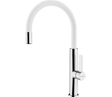 Kuchyňská baterie dřezová; edice Urban Colors White Marble/bílá + lesklý chrom; vysoké otočné ramínko bez výsuvu (výška 420 mm); perlátor s úpravou proti usazování vodního kamene; fixační systém Easy-Quick; flexi kovové připojovací hadičky se závitem 3/8”; pro montáž do otvoru o průměru 35 mm
