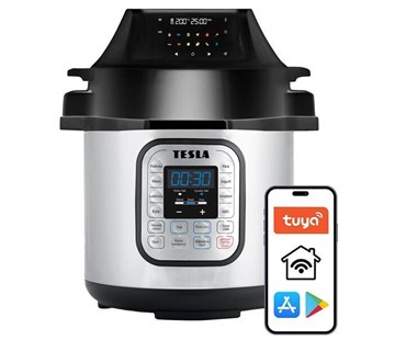 | Multifunkční elektrický tlakový hrnec TESLA EliteCook K70 WiFi Duo je vybaven Wi-Fi připojením. Program, teplotu a další nezbytnosti je tedy možné nastavit i na dálku, a to prostřednictvím mobilní aplikace Smart Life. Samozřejmě lze využít také ovládací tlačítka na předním panelu, která jsou pro vaše pohodlí v češtině. Vybírat můžete ze 12 funkcí, mezi které patří například pomalé vaření, napařování nebo tlakové vaření. Integrovaný termostat vám umožní zvolit vhodnou teplotu. Vyzkoušet lze také funkci časovače, odloženého startu, funkci předehřátí na optimální teplotu nebo funkci pro udržování teploty. Spotřebič vás také včas upozorní na konec zvoleného programu. |  |