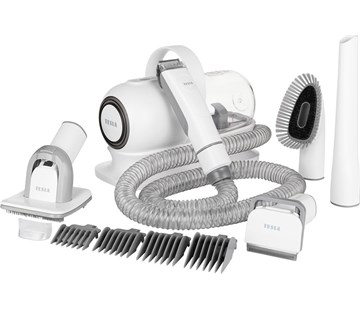 sada pro péči o srst domácích mazlíčků • pro kartáčování, vyčesávání, stříhání a odsávání chlupů • vysavač s flexibilní sací hadicí • trojnásobný filtrační systém (kovový filtr, pěnový filtr, HEPA filtr H13) • vyjímatelný zásobník na nečistoty s kapacitou 1 litr • 3 stupně sacího výkonu • 2,5m přívodní kabel • příkon 300 W • hlučnost 60 dB • příslušenství – 2 nástavce pro odstranění volné srsti, elektrický zastřihovač se 4 nástavci (6 mm, 12 mm, 18 mm, 24 mm), nástavce pro úklid