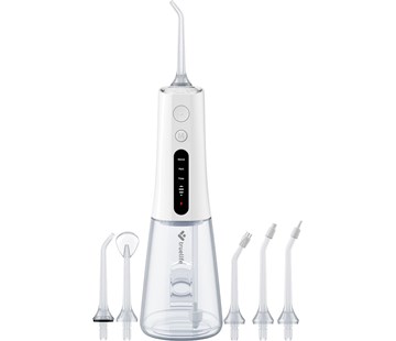 ústní sprcha • technologie StreamTrue • technologii PulseTrue • 3 režimy • nastavitelná intenzita tlaku • automatický časovač na 2 minuty • 360° otočná hlavice • zásobník na vodu o kapacitě 300 ml • ovládání na rukojeti • nabíjení prostřednictvím USB kabelu • voděodolnost IPX7 • výdrž baterie až 14 dní • příslušenství – 6 čisticích trysek L-series (2× tryska Standard, 1× tryska Orthodontic, 1× tryska Periodontal, 1× tryska Dental Plaque, 1× tryska Tongue Cleaner)