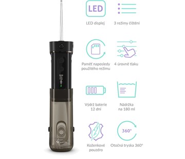 Ústní sprcha TrueLife AquaFloss Mini M50 Black, dobíjecí s výdrží 12 dní, 3 režimy, 4 intenzity tlaku vody, 180ml nádržka, 6 trysek v balení, koženkové pouzdro, technologie StreamTrue®, technologie PulseTrue®, paměť, časovač, displej, Bubble Spraying tryska, otočná hlavice o 360°