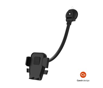 univerzální držák telefonu na čelní sklo či palubní desku • vlastní design vyvinutý v České republice • pro telefony o šířce 5,3 cm - 8,3 cm (uhlopříčka až 6,8") • rychloupínací systém Push and grip pro bezpečné uchycení telefonu • tiché a plynulé ovládání držáku • snadné ovládání jednou rukou • silikonové prvky pro ochranu telefonu • flexibilní rameno s délkou 29 cm • zajišťovací posuvný úchyt s 3M páskou • přísavný podstavec pro připevnění na čelní sklo či palubní desku • znovupoužitelná přísavná základna se silnou přilnavostí • 360° otočný kloub pro nastavení ideálního úhlu • odnímatelné úchyty pro nabíjecí kabel na zadní straně držáku • ponechává volný přístup k nabíjecímu konektoru • rozměry: 105 x 100 x 50 mm • váha: 72 g