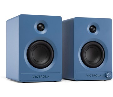 Reproduktory, aktivní, 2.0, o výkonu 80 W (RMS), frekvenční rozsah od 50 Hz do 20 kHz, 2pásmové, Bluetooth 5.4, Auracast Broadcast audio, 3,5 mm jack, RCA (cinch), USB-C, optické digi audio, výstup na subwoofer, 6 Ohm, navrženo pro párování s gramofony Victrola Automatic, Wave a Stream, modrá barva