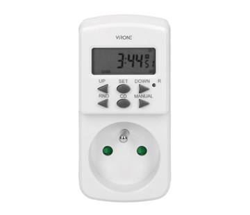 Zásuvka s elektronickým časovačem mini;Napětí: 230V/50Hz;max.příkon: 1800W; stupeň ochrany: IP20; typ hnízda: 2P+Z; proud: 8(1)A; LCD display; 10 programů - 7 kombinací dnů v týdnu, funkce letního a zimního času, funkce COUNT DOWN (odpočet), provozní režim 12 nebo 24 hodin