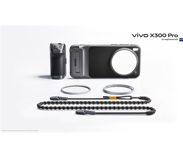 Přídavný fotografický kryt pro VIVO X300 Pro, integrovaná baterie 2300 mAh, sestava fyzických přepínačů (zoom, spoušť, posuvné kolečko a dedikované tlačítko natáčení), Imaging Grip, popruh na telefon, adaptér pro filtr 62 mm, 2x krytky objektivu, 3x rychloupínací spony (2x předinstalovány na popruhu)