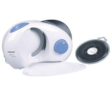 Alexis Young, příkon 200 W, hloubka řezu 0-15 mm, jištění před nesprávnou manipulací, jednoduchá údržba, moderný design, vysoká stabilita, ve výbavě speciální nůž na uzeniny a sýry, provedení bílo/modrý