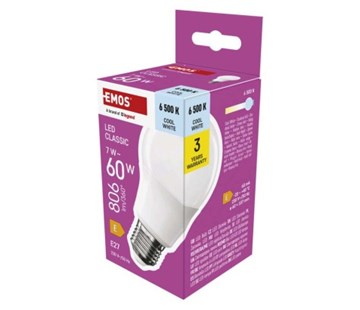 patice (uchycení žárovky) E27, barva světla studená bílá, náhrada za žárovku 60 W, tvar A60, světelný tok 806 lm, teplota chromatičnosti 6 500 K, příkon 7 W, energetická třída E, životnost 30 000 hodin, záruční doba 3 roky, napětí 230 V~/50 Hz, rozměr 60 × 60 × 107 mm