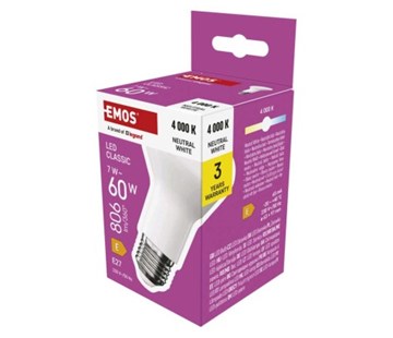patice (uchycení žárovky) E27, barva světla neutrální bílá, náhrada za žárovku 60 W, tvar R63, světelný tok 806 lm, teplota chromatičnosti 4 000 K, příkon 7 W, energetická třída E, životnost 30 000 hodin, záruční doba 3 roky, napětí 230 V~/50 Hz, rozměr 63 × 63 × 97 mm